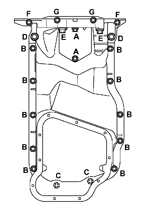 3. Using the letter symbols in the table shown, install the upper oil pan using the correct bolt. Refer to the table for proper torque.