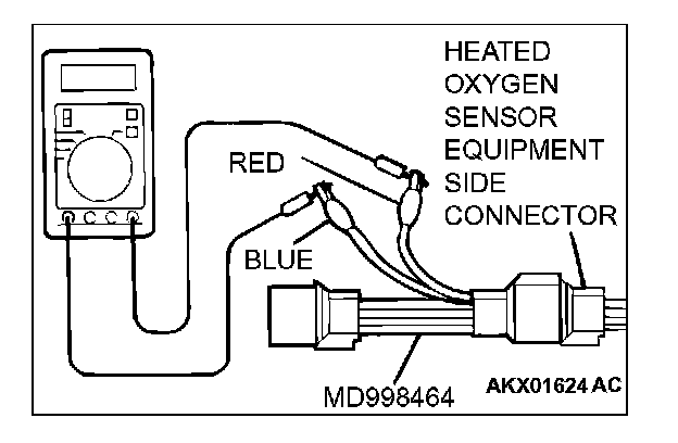 1. Disconnect the heated oxygen sensor connector and connect special tool MD998464 to the connector on the heated oxygen sensor side.