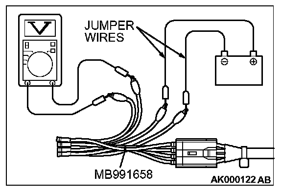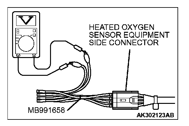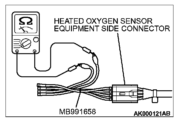 1. Disconnect the heated oxygen sensor connector and connect special tool MB991658 to the connector on the heated oxygen sensor side.