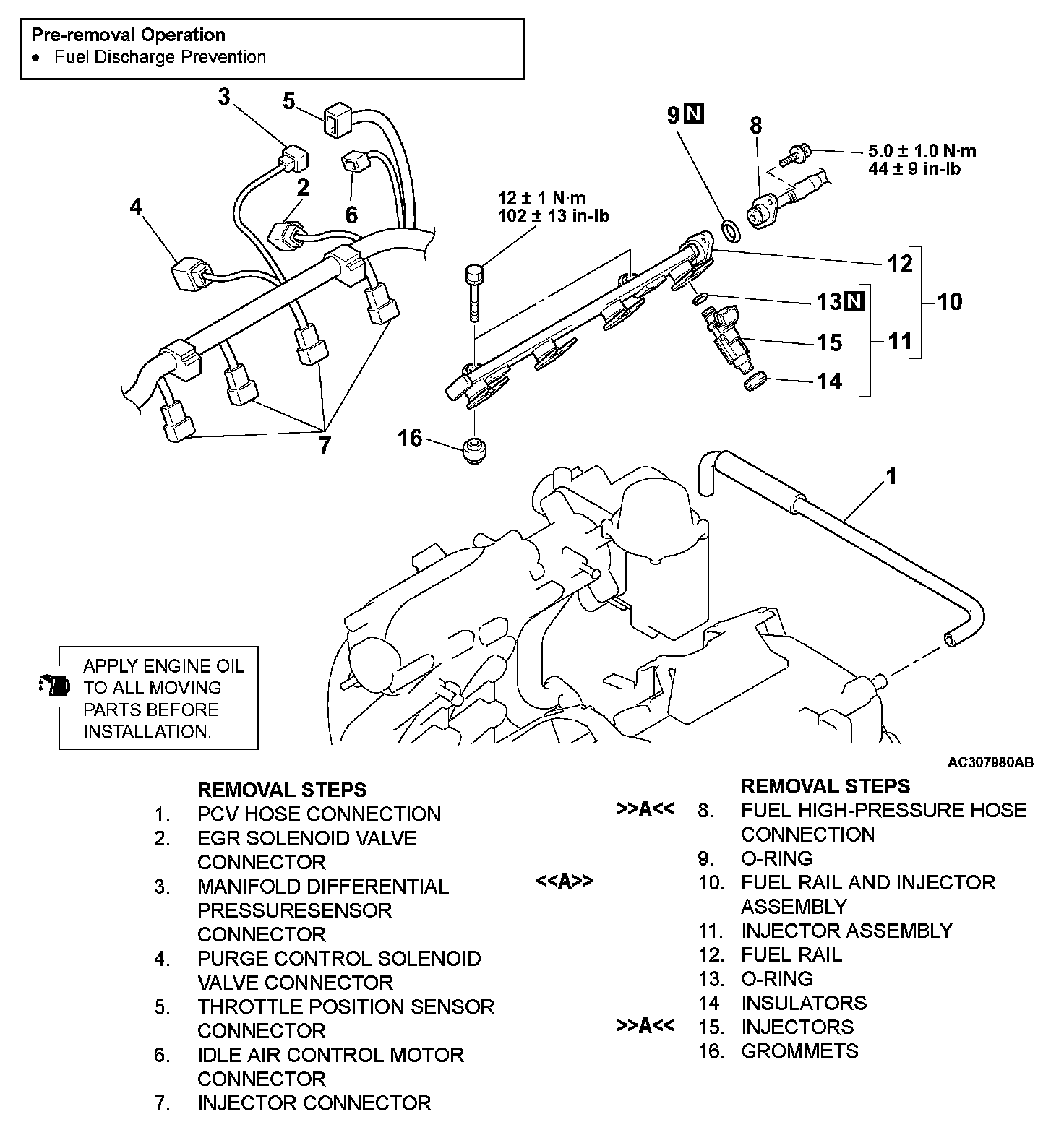 CAUTION: Do not let the engine oil get into the fuel rail will be damaged.
