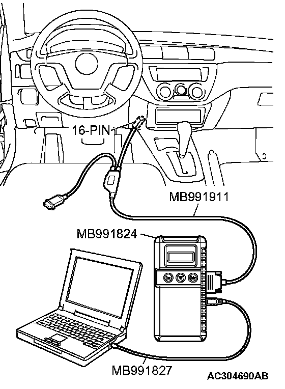 CAUTION: To prevent damage to scan tool MB991958, always turn the ignition switch to the "LOCK" (OFF) position before connecting or disconnecting scan tool MB991958.