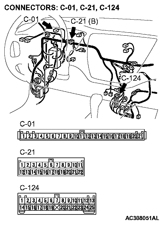 STEP 5. Check combination meter connector C-01, joint connector C-21, intermediate connector C-124 and PCM connector C-116 for loose, corroded or damaged terminals, or terminals pushed back in the connector.