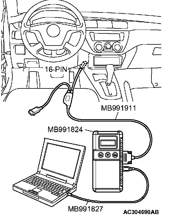 CAUTION: To prevent damage to scan tool MB991958, always turn the ignition switch to the "LOCK" (OFF) position before connecting or disconnecting scan tool MB991958.