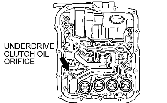 2. Blow 108 kPa (15 psi) compressed air into the underdrive clutch oil orifice of the transaxle case, and check if the underdrive clutch piston moves and air pressure is maintained in that condition.