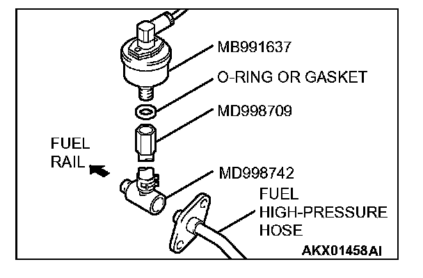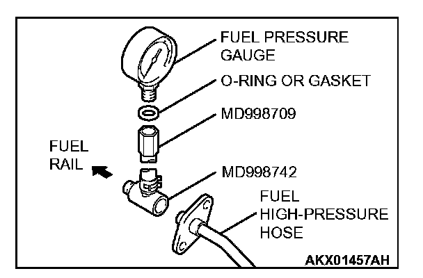 2. Place a suitable O-ring or gasket on assembled special tools MD998709 and MD998742 and install the fuel pressure gauge.