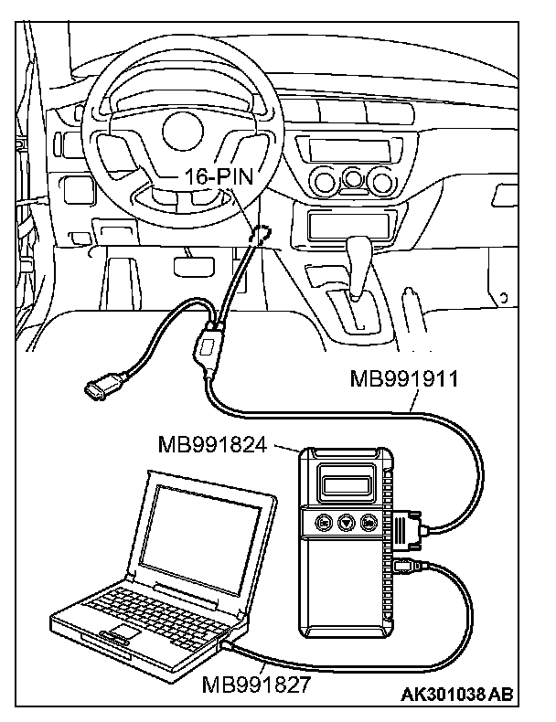 CAUTION: To prevent damage to scan tool MB991958, always turn the ignition switch to the "LOCK" (OFF) position before connecting or disconnecting scan tool MB991958.