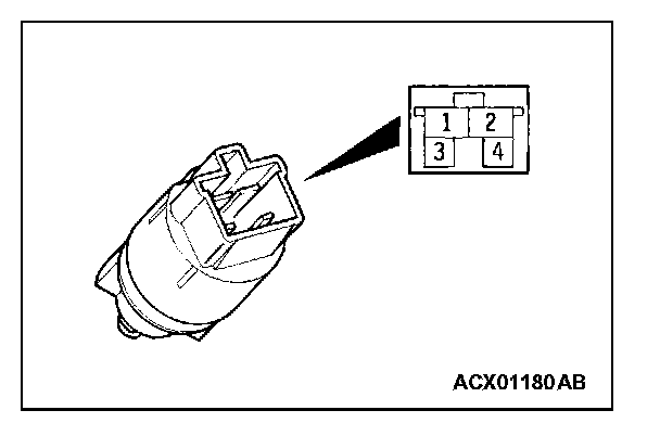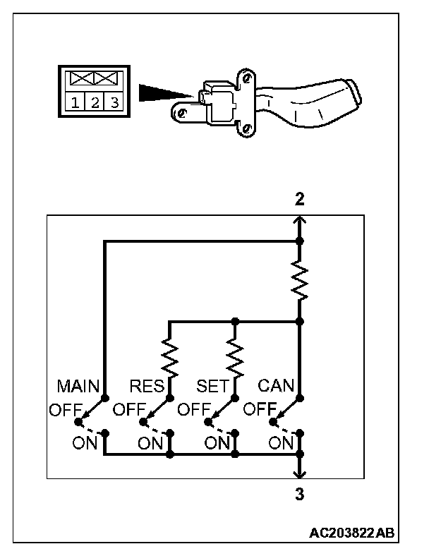2. Measure the resistance between terminal 2 and terminal 3 when each of the "COAST/SET", "ACC/RES", "CANCEL" and "CRUISE" (MAIN) switches is pressed. If the values measured at the time correspond to those in the table, the resistance values are correct.