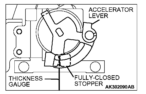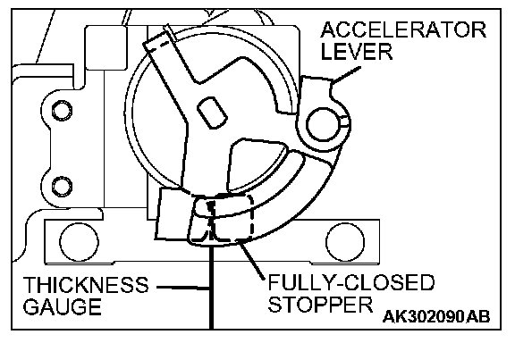 4. Insert a thickness gauge with a thickness of 0.60 mm (0.024 in.) in between the accelerator lever and the fully closed stopper.