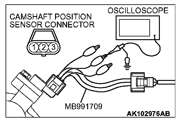 1. Disconnect the camshaft position sensor connector, and connect the test harness special tool (MB991709) between the separated connector. (All terminals should be connected.)