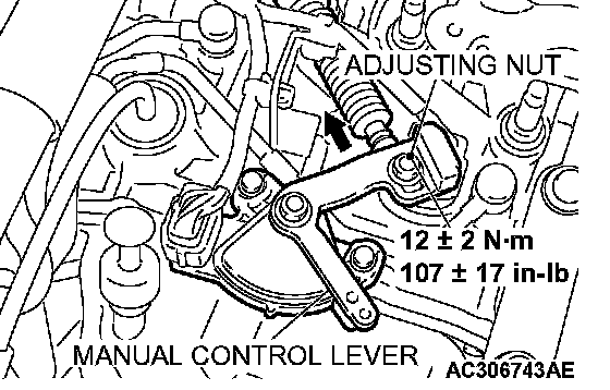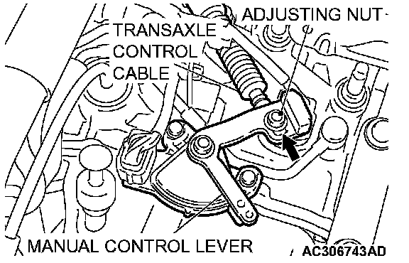 6. Gently push the transaxle control cable in the direction of the arrow, until the cable is taut. Tighten the adjusting nut.