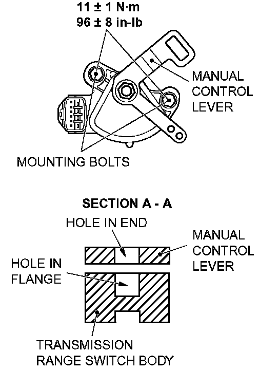 4. Loosen the transmission range switch body mounting bolts and turn the park/neutral position switch body so the hole in the end of the manual control lever and the hole (section A-A in the figure on the left) in the flange of the transmission range switch body flange are aligned.