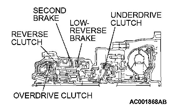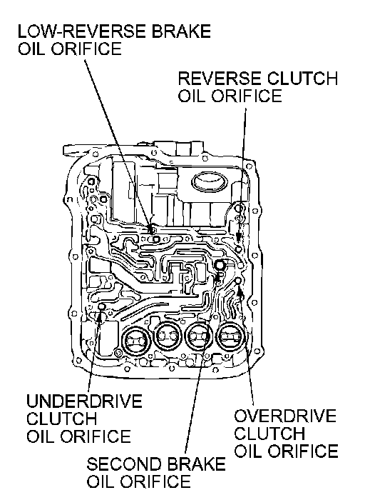2. Blow 108 kPa (15 psi) compressed air into the each brake oil orifice and clutch oil orifice of the transaxle case, and check if each brake and each clutch piston move and air pressure is maintained.