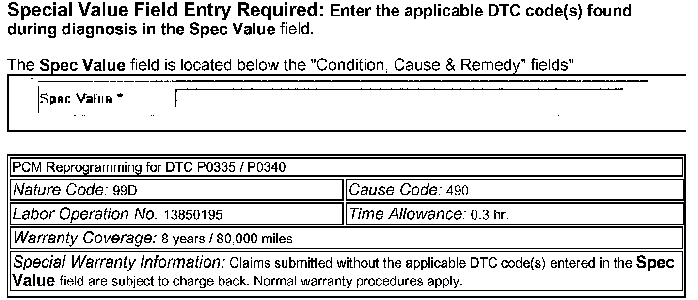 On some affected vehicles, incorrect software parameters in the PCM may cause the MIL to illuminate and Diagnostic Trouble Code P0335 and/or P0340 (crankshaft or camshaft position sensor circuit) to set in the PCM. To eliminate this condition, reprogram the PCM as described in this bulletin.