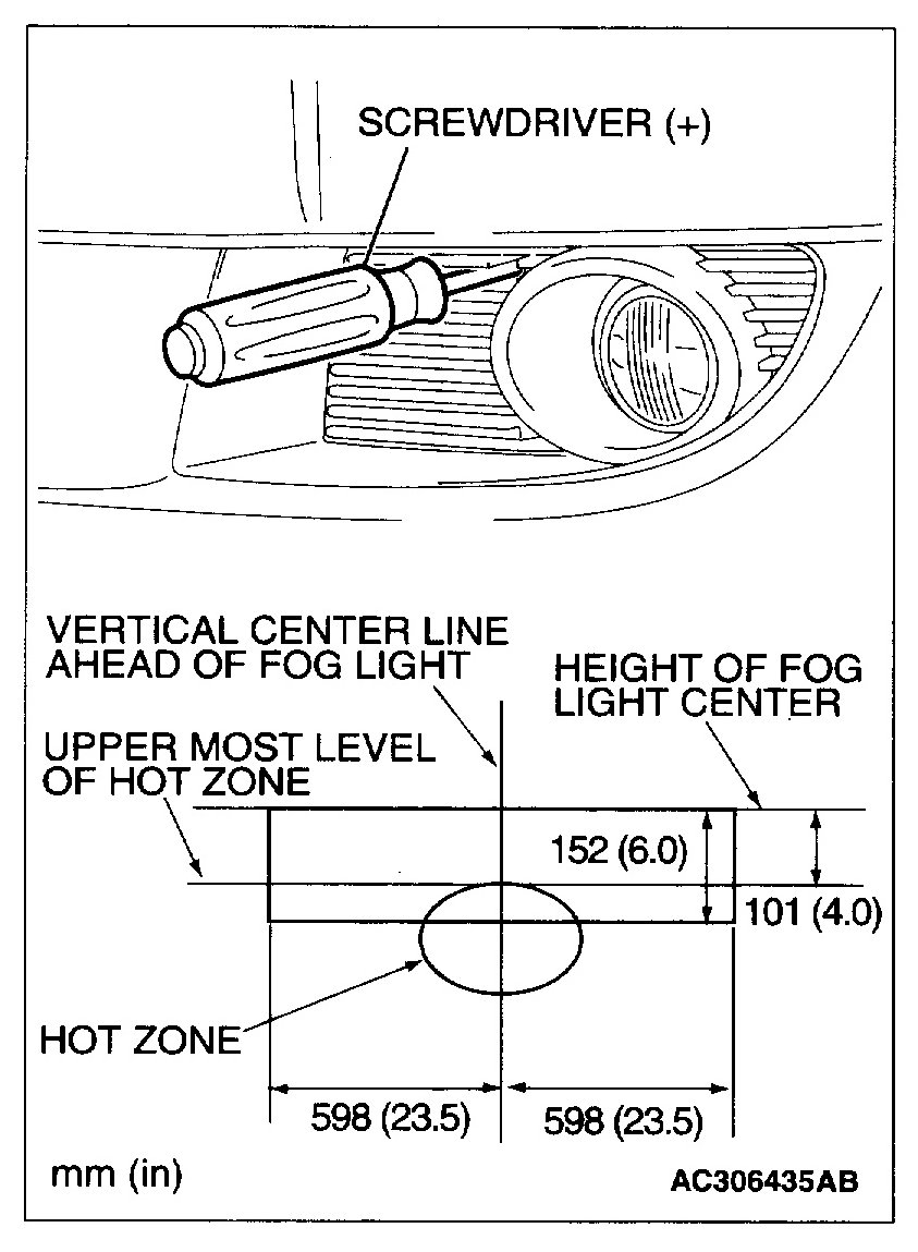 Limit: (Vertical direction): Top of the hot zone should be 152 mm (6.0 inches) below the fog light center (equivalent to the fog light beam angle of 1.14 degrees angle).