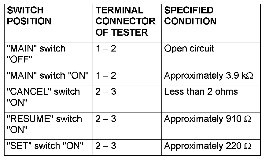Measure the resistance between the terminals when each of the "SET", "RESUME", "CANCEL" and "MAIN" switches is pressed. If the values measured at the time correspond to those in the table below, the resistance values are correct.