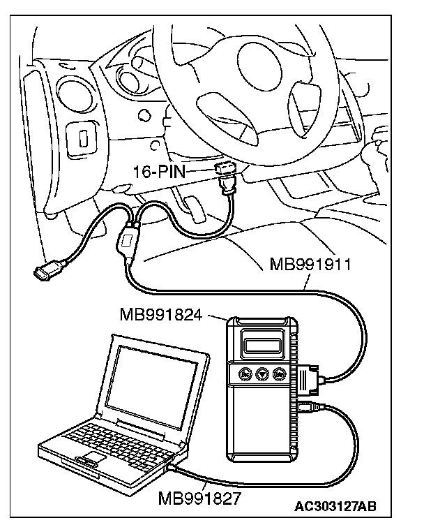 CAUTION: To prevent damage to scan tool MB991958, always turn the ignition switch to the "LOCK" (OFF) position before connecting or disconnecting scan tool MB991958.