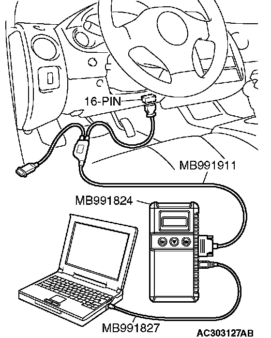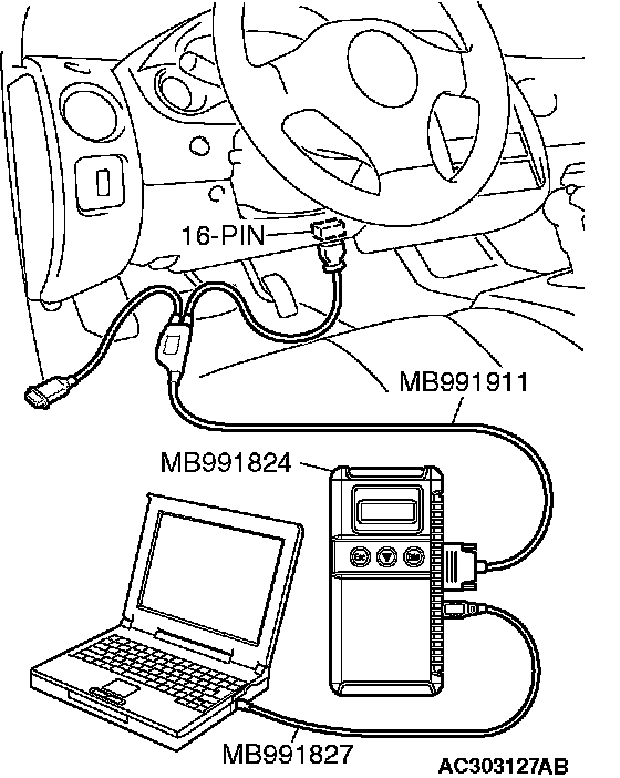 CAUTION: To prevent damage to scan tool MB991958, always turn the ignition switch to the "LOCK" (OFF) position before connecting or disconnecting scan tool MB991958.