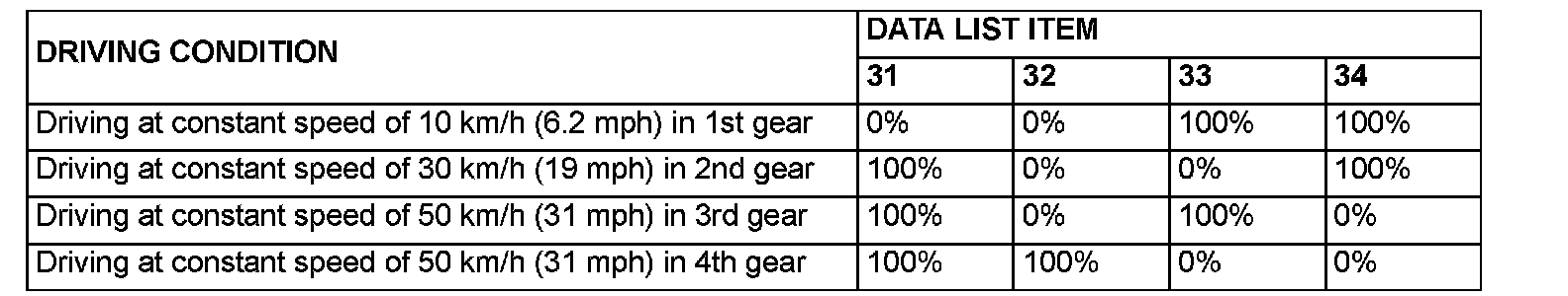d. Item 34: Overdrive Solenoid Valve Duty Percent Check that the values shown below are displayed when each data list item is entered.