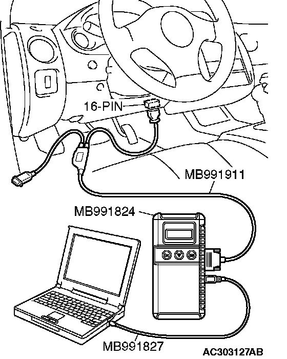 CAUTION: To prevent damage to scan tool MB991958, always turn the ignition switch to the "LOCK" (OFF) position before connecting or disconnecting scan tool MB991958.
