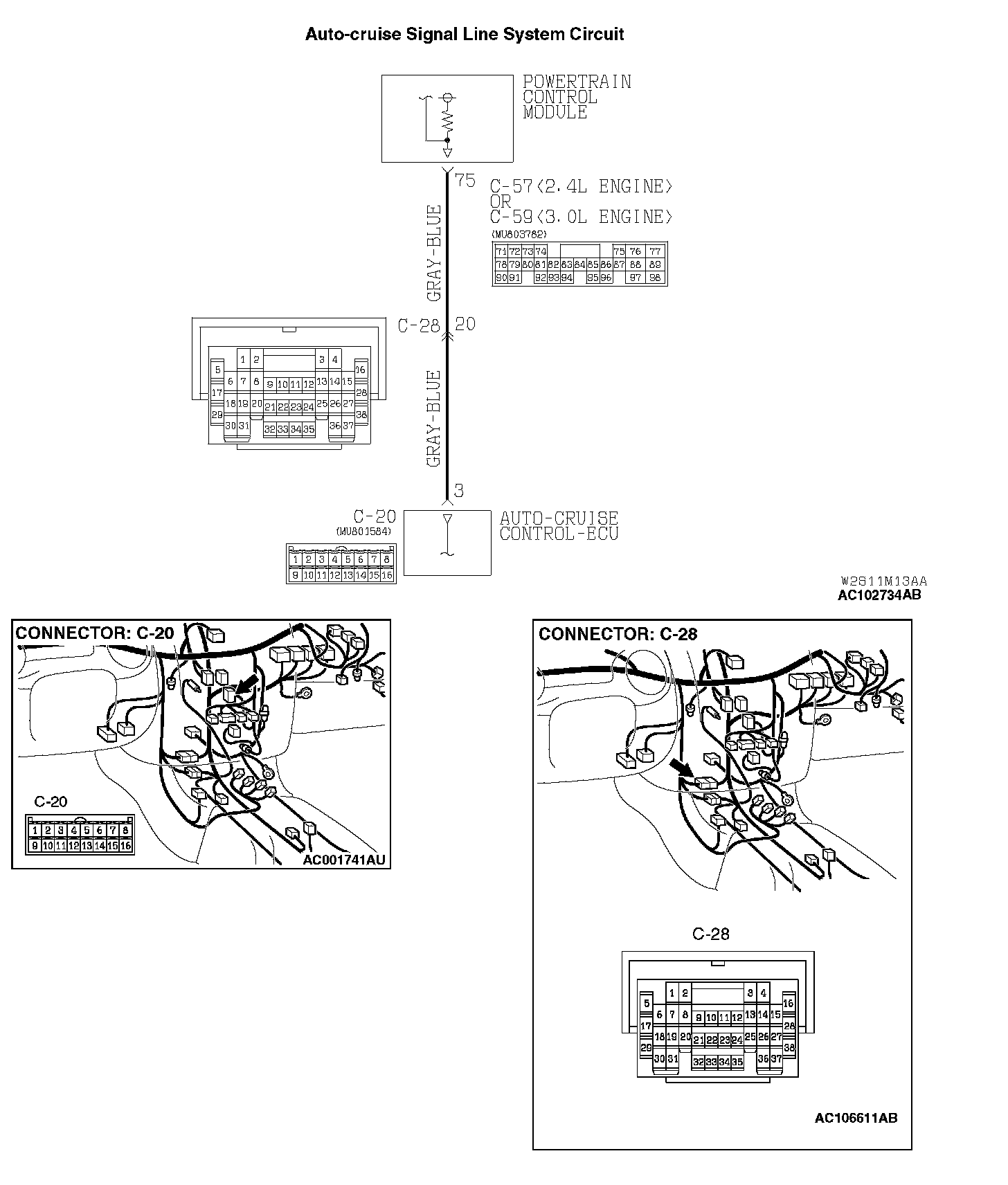 STEP 5. Check the harness for open circuit, short circuit to ground or damage between PCM connector C-57 <2.4L Engine> or C-59 <3.0L Engine> terminal 75 and auto-cruise control-ECU connector C-20 terminal 3.