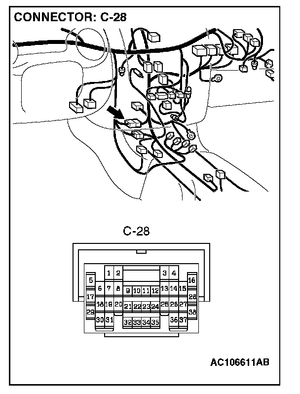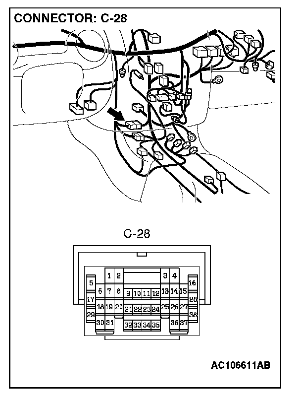 STEP 4. Check PCM connector C-57 <2.4L Engine> or C-59 <3.0L Engine> and inter mediate connector C-28 for looser, corroded or damaged terminals, or terminals pushed back in the connector.