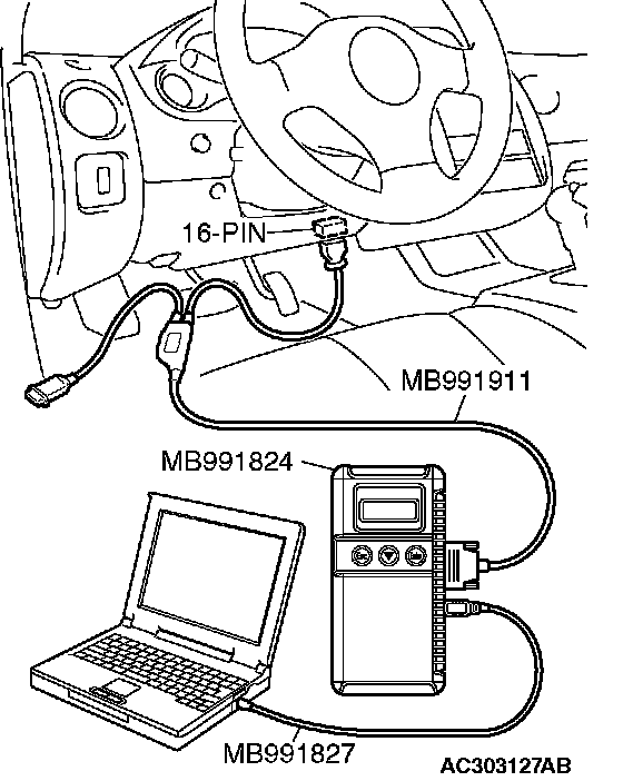 CAUTION: To prevent damage to scan tool MB991958, always turn the ignition switch to the "LOCK" (OFF) position before connecting or disconnecting scan tool MB991958.