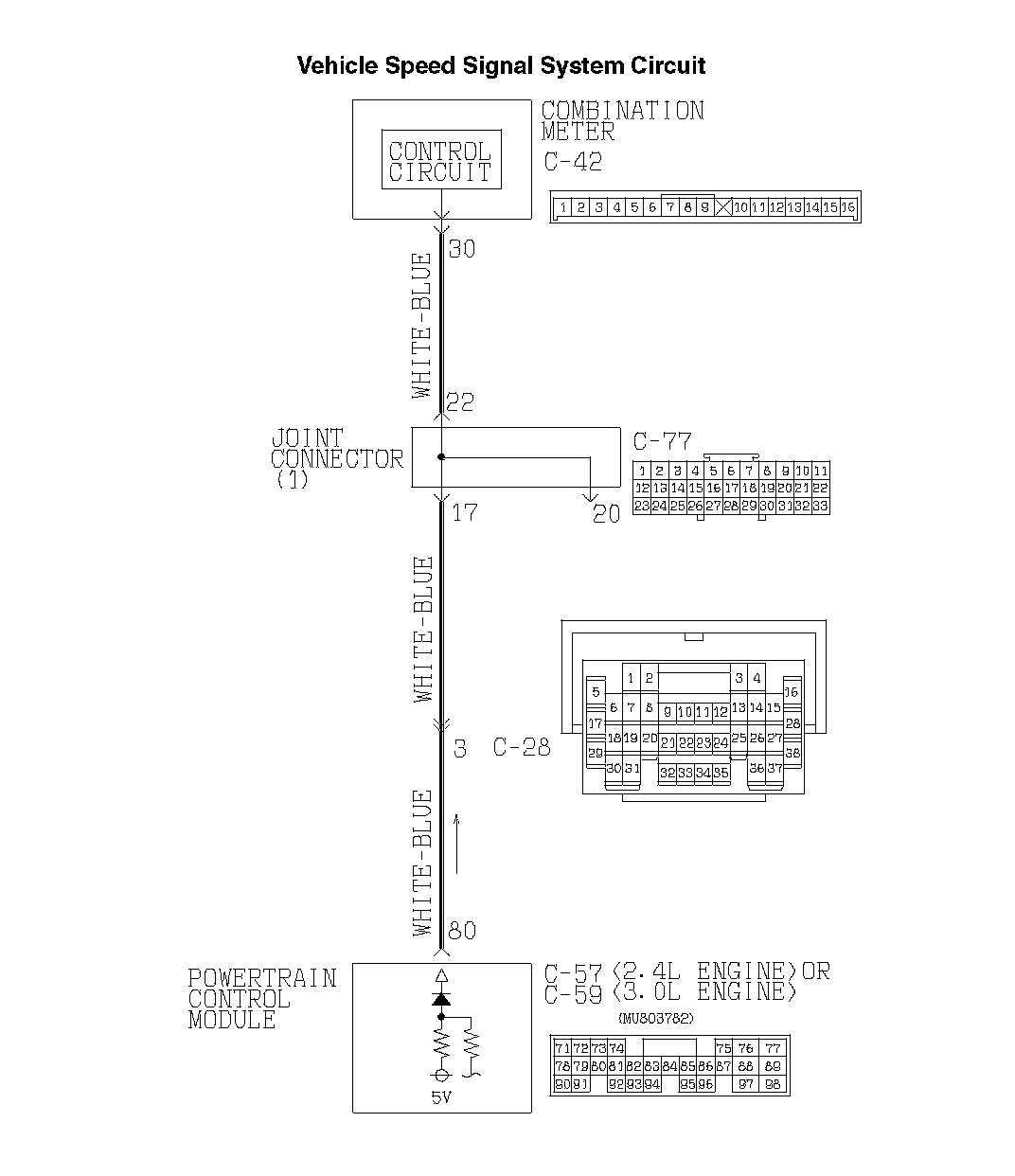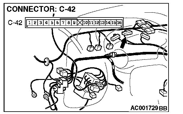 STEP 6. Check the harness for open circuit, short circuit to ground or damage between PCM connector C-57 <2.4L Engine> or C-59 <3.0L Engine> terminal 80 and combination meter connector C-42 terminal 30.
