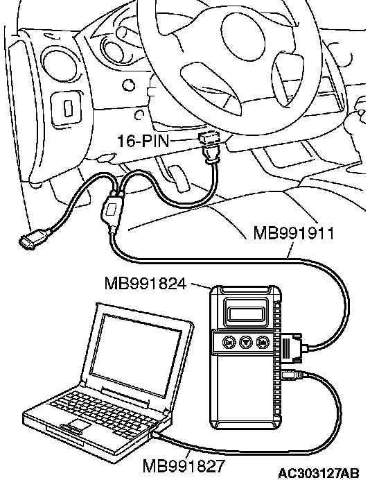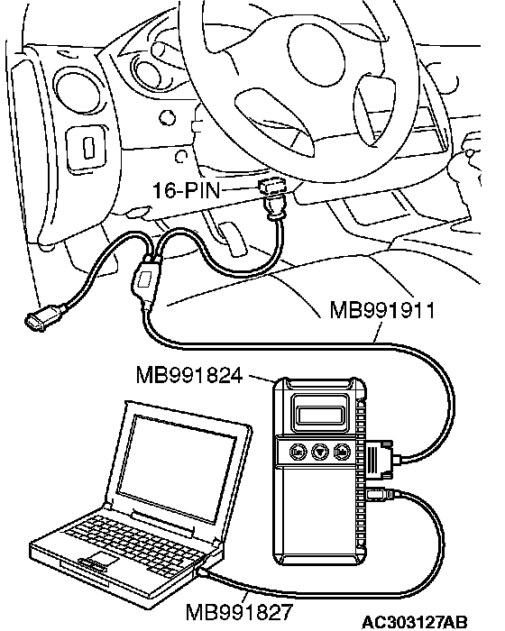 CAUTION: To prevent damage to scan tool MB991958, always turn the ignition switch to the "LOCK" (OFF) position before connecting or disconnecting scan tool MB991958.
