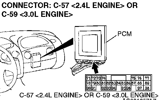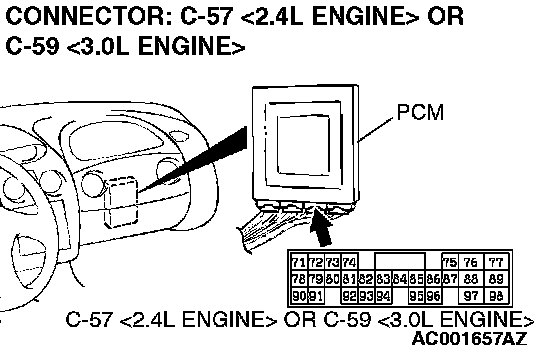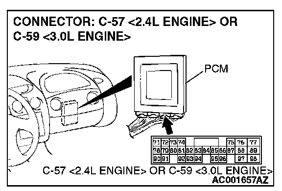 STEP 4. Check PCM connector C-57 <2.4L Engine> or C-59 <3.0L Engine> for loose, corroded or damaged terminals, or terminals pushed back in the connector.
