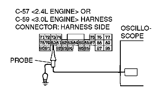 2. Connect an oscilloscope probe to PCM connector C-57 <2.4L Engine> or C-59 <3.0L Engine> terminal 80 by backprobing.