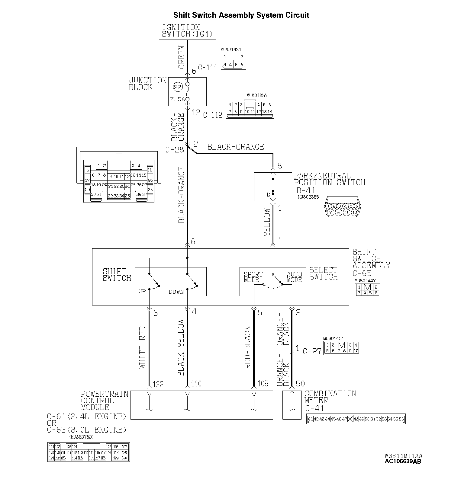 STEP 15. Check the harness for open circuit or short circuit to ground between PCM connector C-61 <2.4L Engine> or C-63 <3.0L Engine> terminal 109 and shift switch assembly connector C-65 terminal 5.