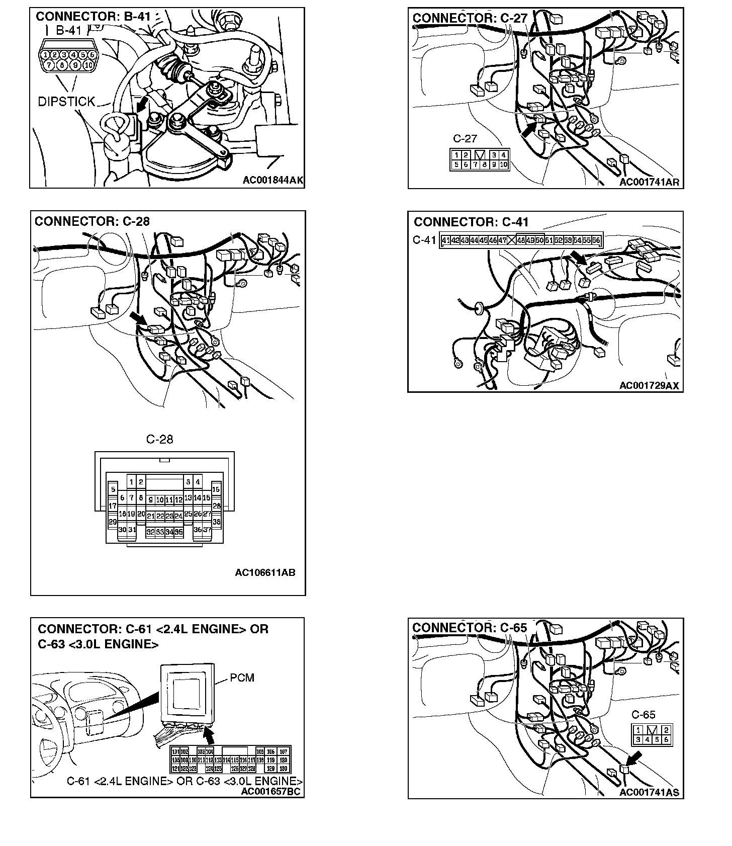 STEP 14. Check PCM connector C-61 <2.4L Engine> or C-63 <3.0L Engine> and shift switch assembly connector C-65 for looser, corroded or damaged terminals, or terminals pushed back in the connector.