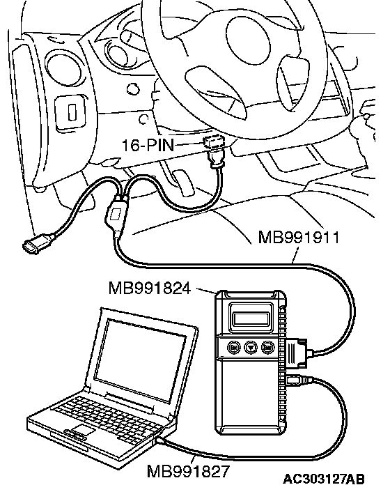 CAUTION: To prevent damage to scan tool MB991958, always turn the ignition switch to the "LOCK" (OFF) position before connecting or disconnecting scan tool MB991958.