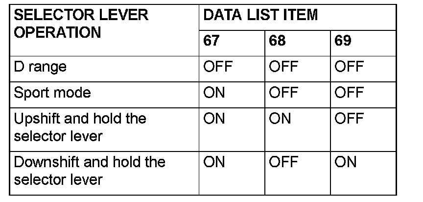 STEP 4. Using scan tool MB991958, check data list item 67: Select Switch, item 68: Shift Switch (Up), item 69: Shift Switch (Down).