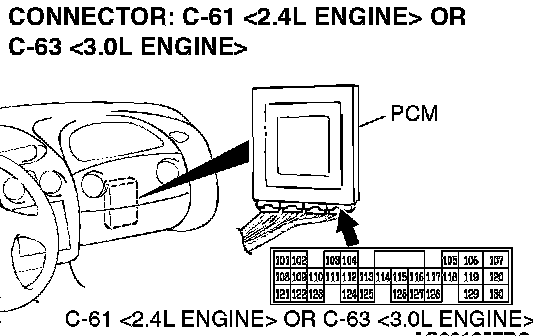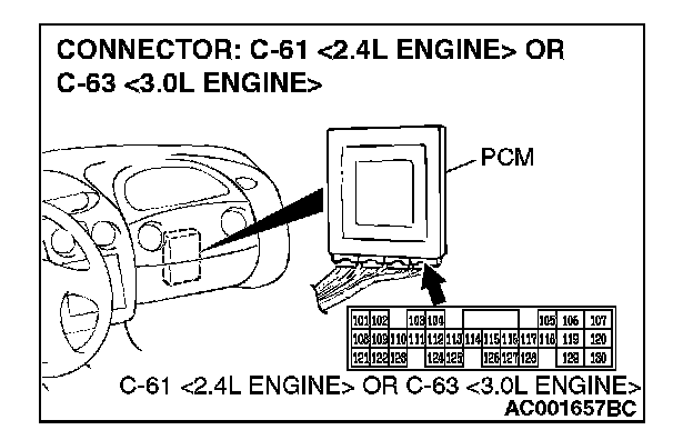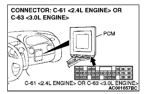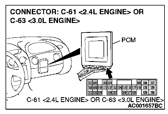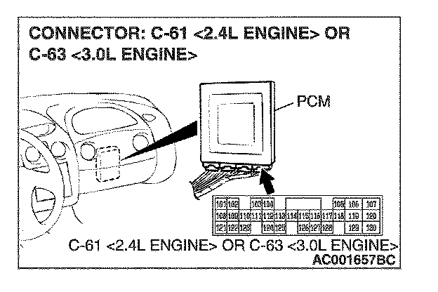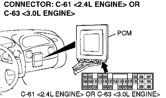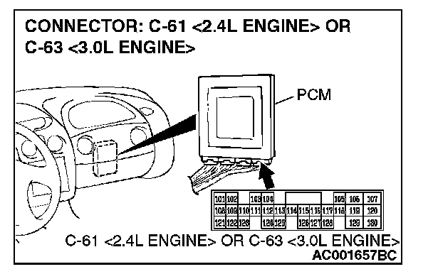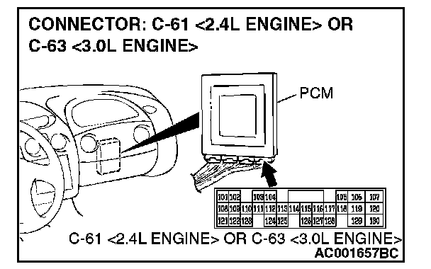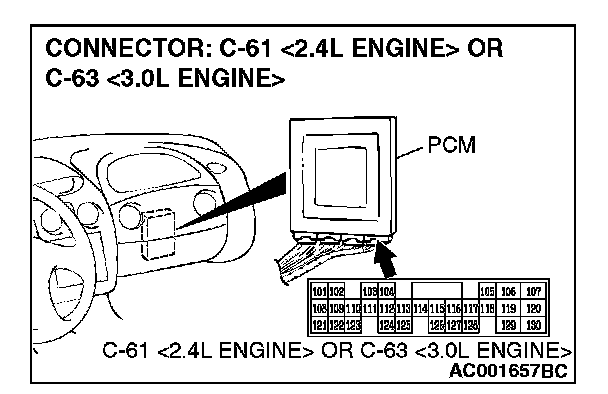 STEP 16. Check PCM connector C-61 <2.4L Engine> or C-63 <3.0L Engine> for looser, corroded or damaged terminals, or terminals pushed back in the connector.