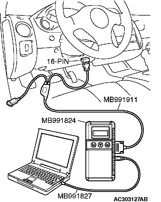 CAUTION: To prevent damage to scan tool MB991958, always turn the ignition switch to the "LOCK" (OFF) position before connecting or disconnecting scan tool MB991958.