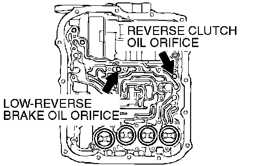2. Blow 108 kPa (15 psi) compressed air into the reverse clutch oil orifice of the transaxle case. Then check if the reverse clutch piston moves and air pressures are maintained in that condition. Repeat for the low-reverse brake.