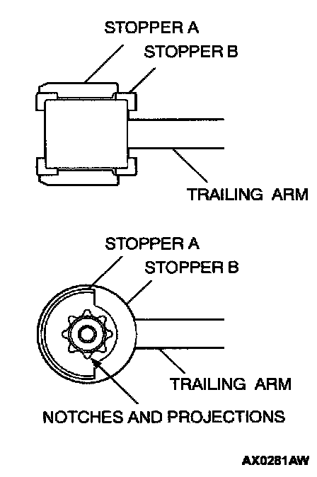 2. Install stopper A in the shown direction while checking that the notches on stopper A are engaged with the projections on the trailing arm bushing.