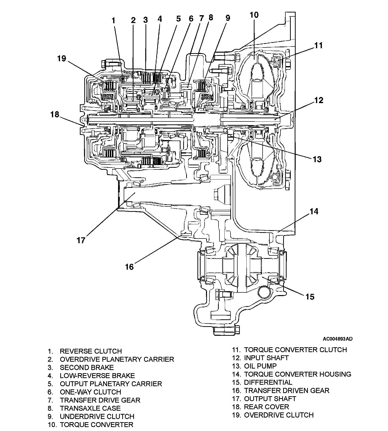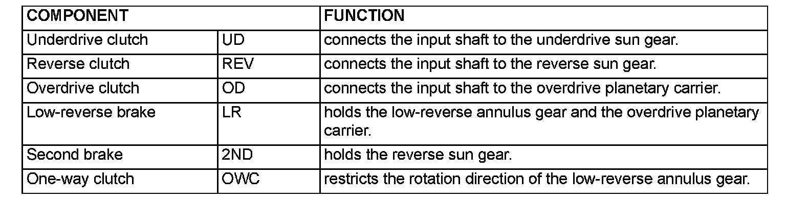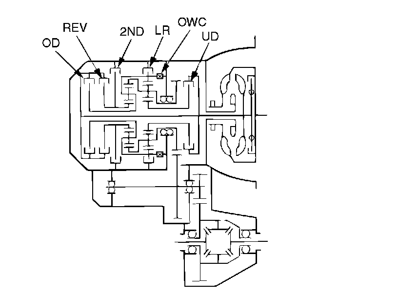 The transaxle is made up of the torque converter and gear train. A 3-element, 1-step, 2-phase torque converter with built-in torque converter clutch is used. The gear train is made up of three sets of multi-plate clutches, two sets of multi-plate brakes, one set of one-way clutches and two sets of planetary gears. The planetary gears are made up of sun gears, carriers, pinion gears and annulus gears.