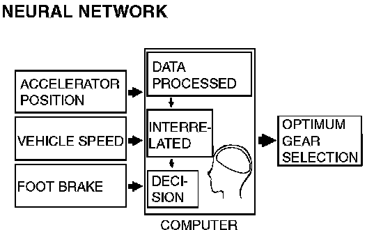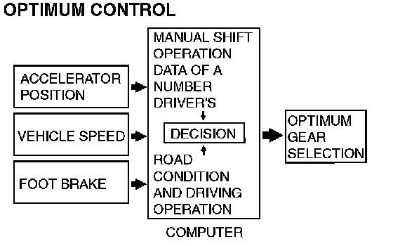 1. The shift patterns found satisfying by the typical driver for all ranges of driving are stored in the computer's memory. The computer uses this data to analyze road conditions and the driver's style of operation, and then outputs the optimal shift patterns stored in its memory to best match the conditions.
