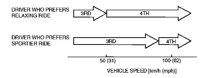 NOTE Within 2 -to- 3 and 3 -to- 4 movement ranges, the PCM adjusts shift points according to the driving conditions by memorizing the accelerator pedal stroke and braking timing.