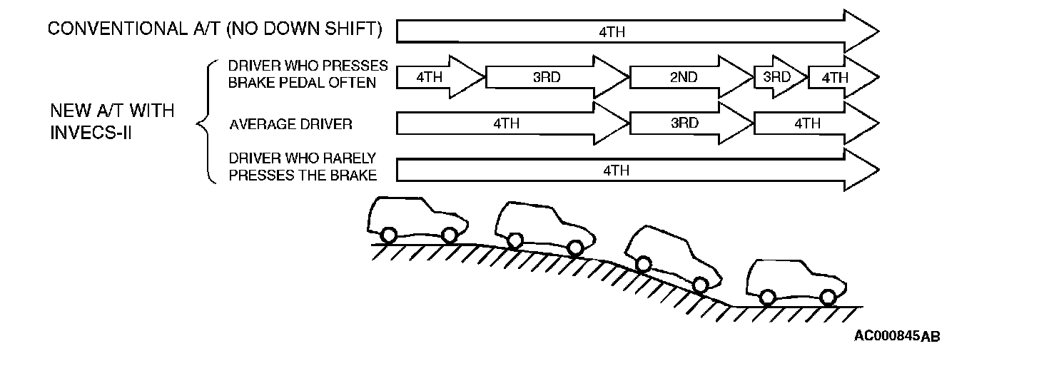 3. If the computer determines that the driver tends to apply the brakes often on a descending roadway, it adjusts timing to down shift sooner so that engine braking is more effectively applied. Conversely, if the computer determines that the driver does not brake much while driving downhill, it delays downshifting to minimize the effect of engine braking.
