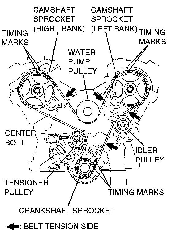 TIMING BELT INSTALLATION1. Align the timing marks on the camshaft sprockets with those on the rocker cover and the timing mark on the crankshaft sprocket with that on the engine block as shown in the illustration.