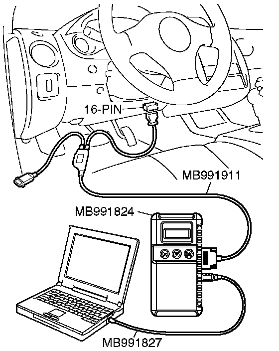 NOTE: Disconnecting scan tool MB991958 is the reverse of the connecting sequence, making sure that the ignition switch is at the "LOCK" (OFF) position.
