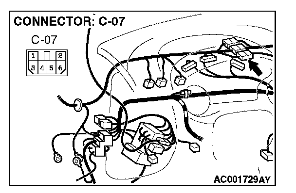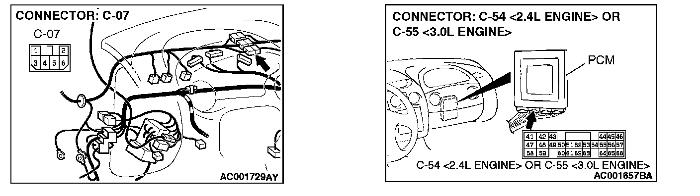 STEP 3. Check intermediate connector C-07 and PCM connector C-54 <2.4L Engine> or C-55 <3.0L Engine> for loose, corroded or damaged terminals, or terminals pushed back in the connector.