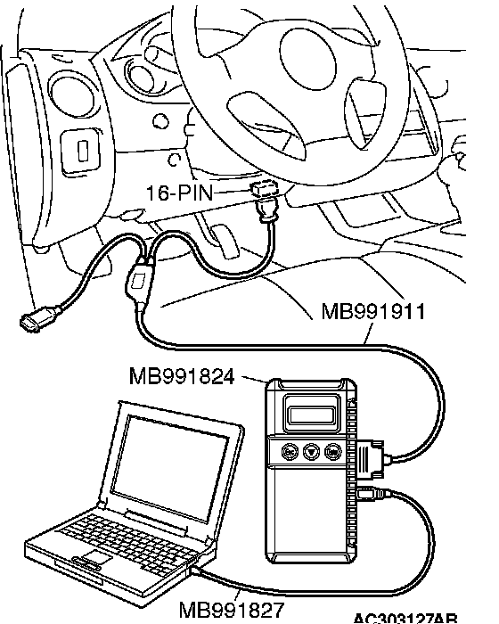 CAUTION: To prevent damage to scan tool MB991958, always turn the ignition switch to the "LOCK" (OFF) position before connecting or disconnecting scan tool MB991958.