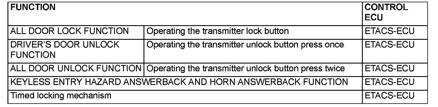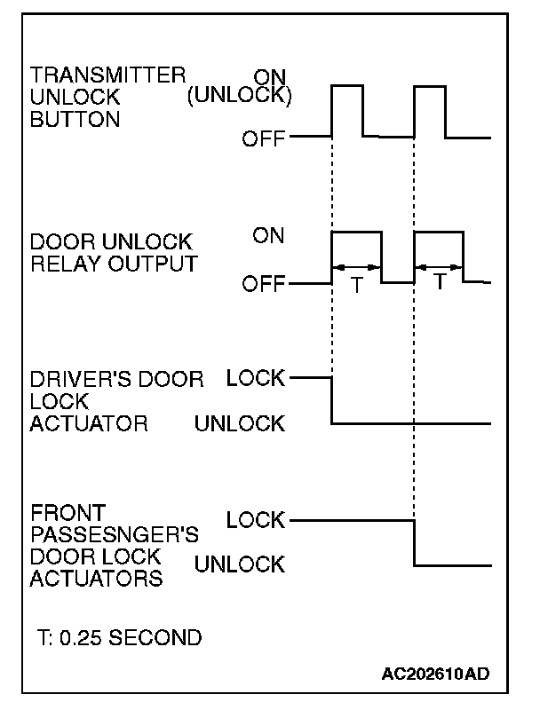When the transmitter unlock button is pressed twice, the ETACS-ECU energizes its door unlock relay to operate the driver's door lock actuator and the other door lock actuators for 0.25 second each in succession. Then, the doors will be unlocked.