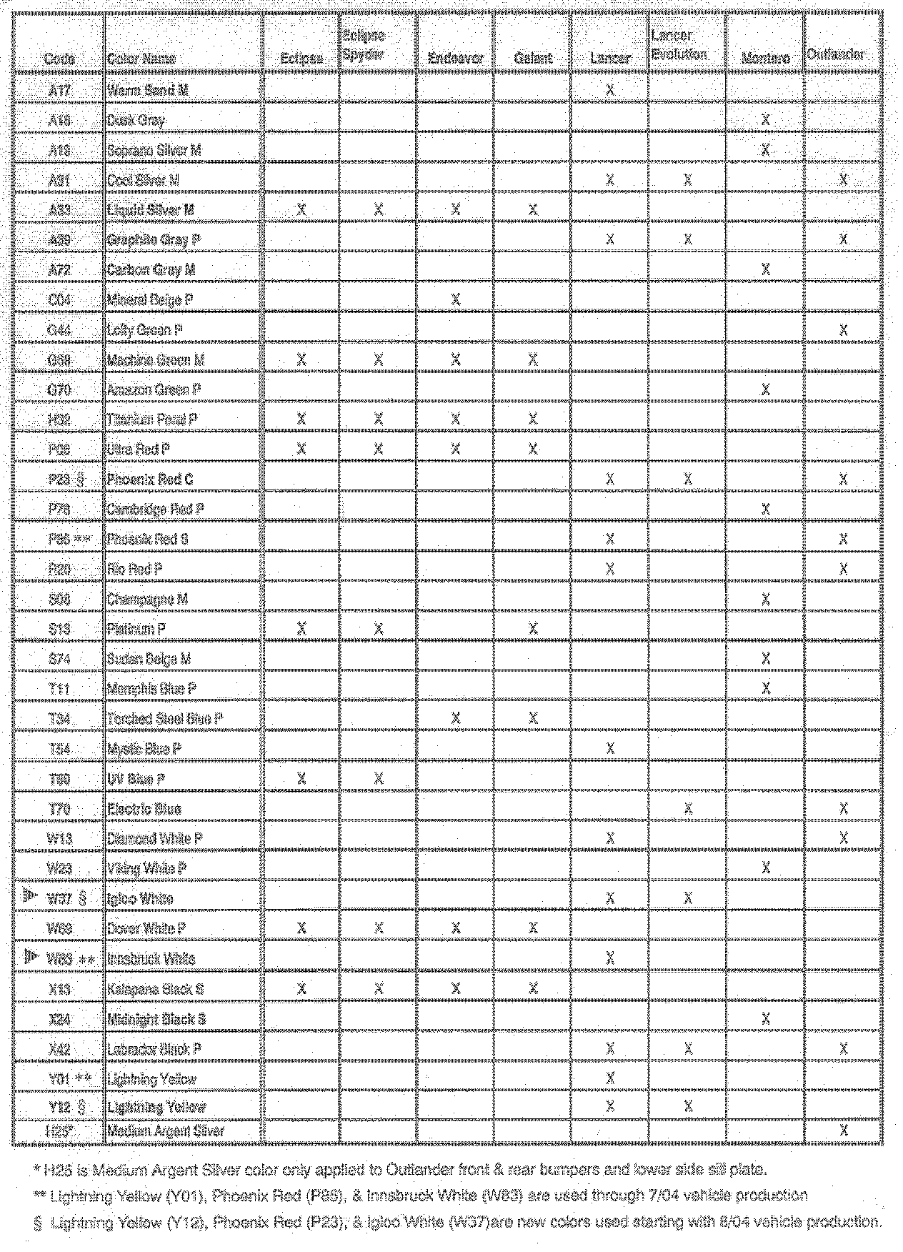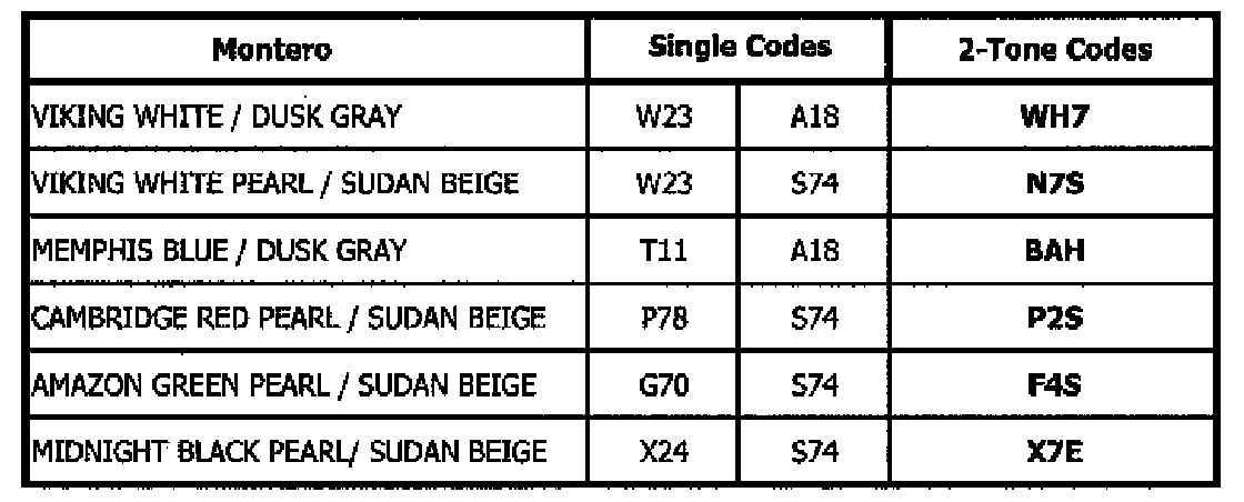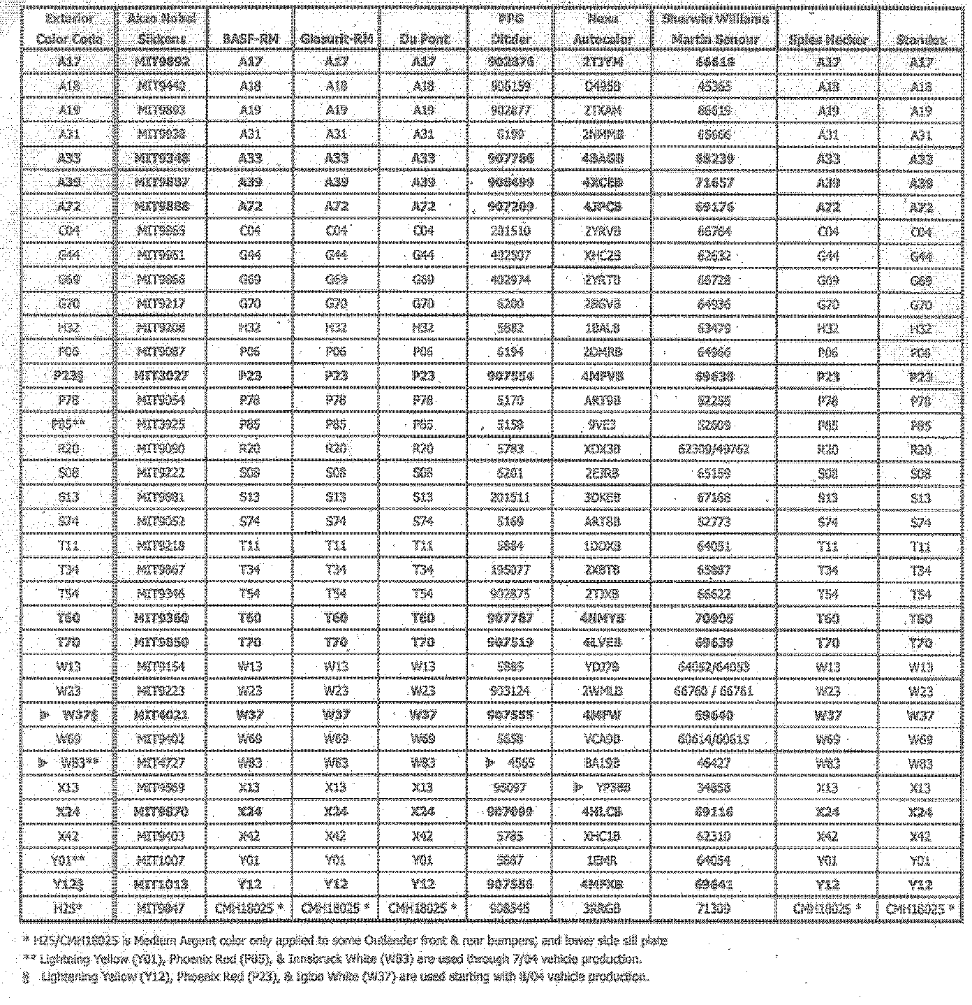 There are thirty-six (36) colors included in the 2005 model line-up. Twenty-seven (27) colors are carried over from previous years and nine (9) are new. Also, there are six (6) two-tone exterior color combinations for the Montero. Regardless of the main body color, all Outlander models have front and rear bumpers and side sill plates painted in Medium Argent Silver (see Tables 1 and 2).