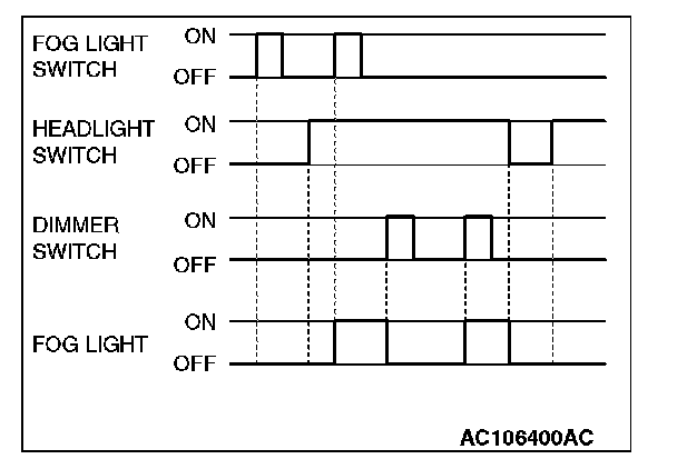 NOTE: This description covers the fog lights only. In actual driving, the fog lights may be turned off due to the headlight automatic shut-down function. For the details on the headlight automatic shut-down function, Refer to General Description Concerning the Headlight and Taillight