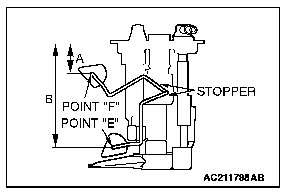 1. Move the float and measure height A at point "F" (highest) and B at point "E" (lowest) with the float arm touching stopper.